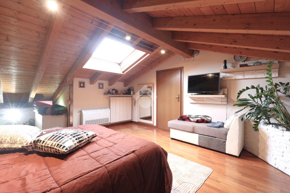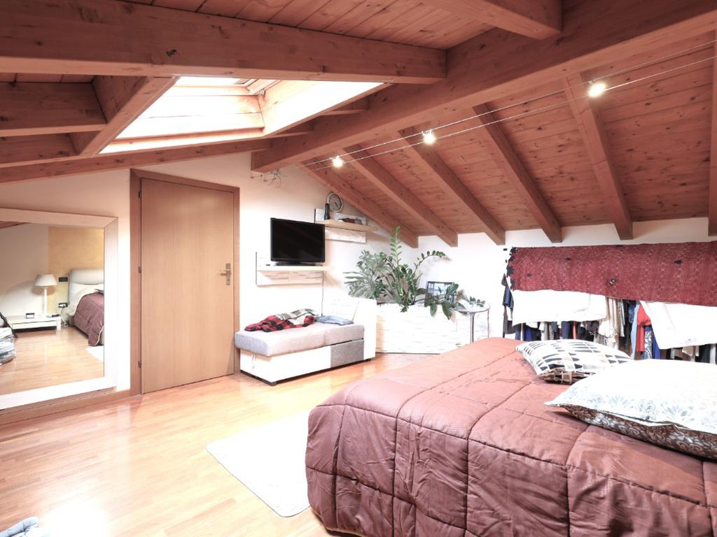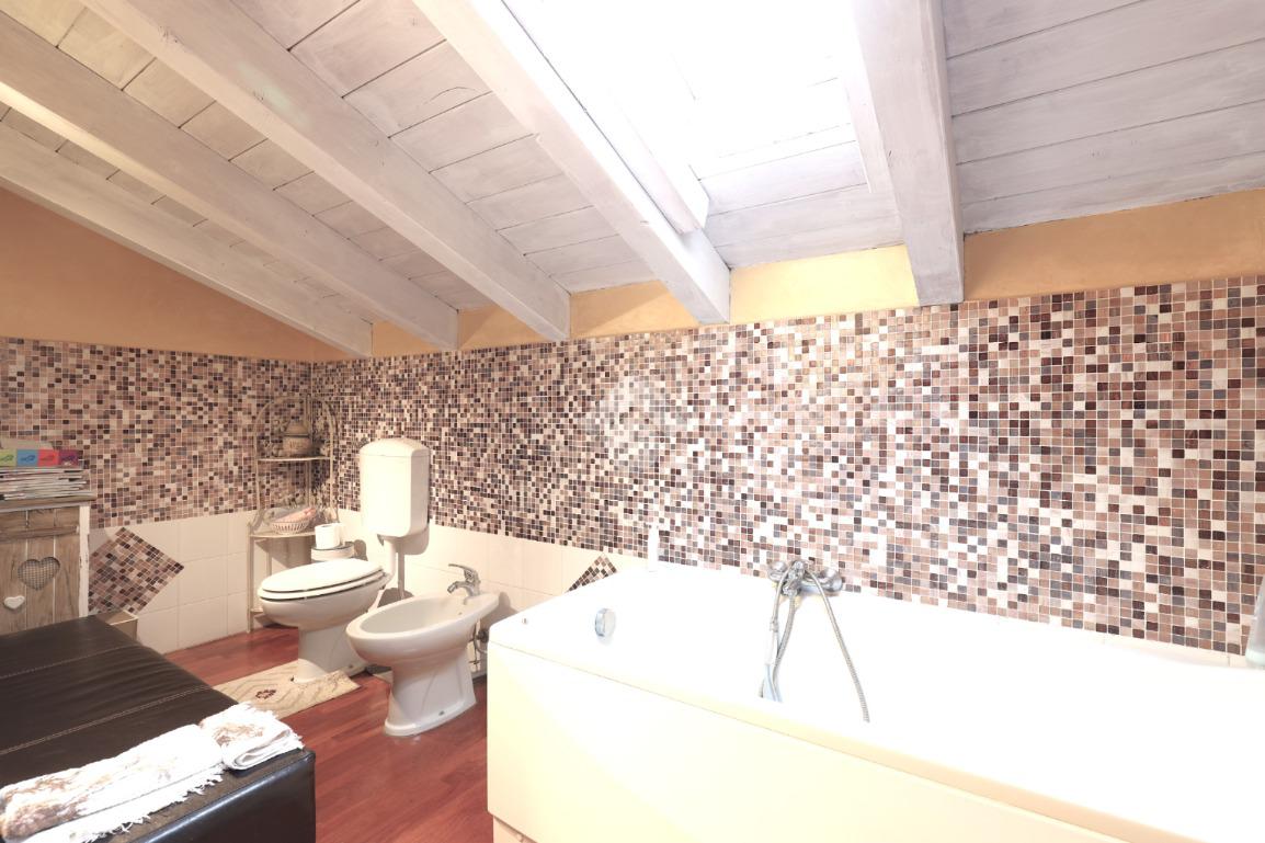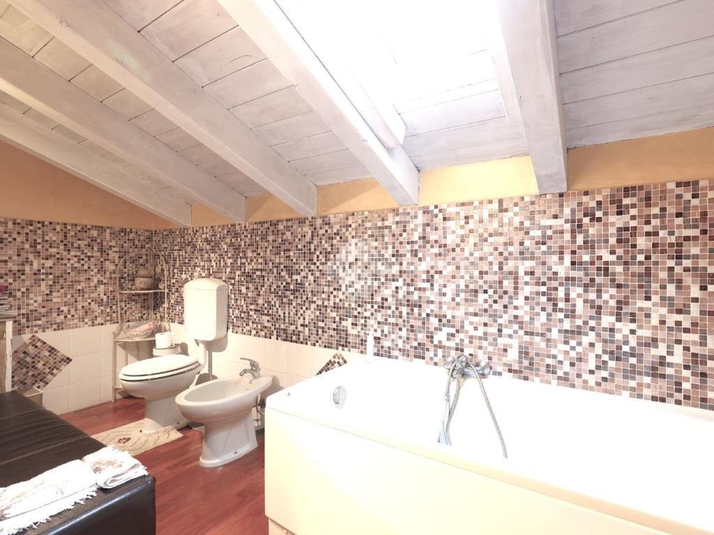 L'interno della casa è caratterizzato da una cucina abitabile separata dalla sala doppia, con accesso diretto all'esterno, ideale per pranzi estivi. Le due camere da letto sono spaziose e luminose, mentre la mansarda offre grandi travi a vista e pavimentazione in parquet, creando un'atmosfera calda e accogliente. Il bagno nella mansarda e un ulteriore bagno al piano terra garantiscono comfort e praticità per tutta la famiglia.